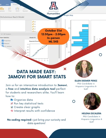 Description: This introductory workshop will walk participants through the basics of Jamovi, a user-friendly statistical software ideal for students and researchers in the Humanities and beyond. Attendees will learn how to organize data, run key statistical tests, and interpret results with confidence.